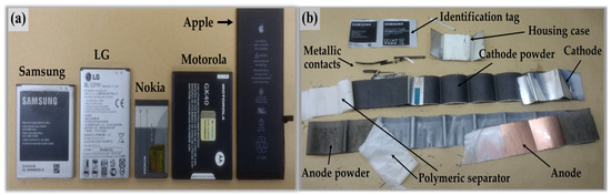 The five most common models/brands of LIBs that were chosen to perform the characterization are shown in Figure 1a,b shows one of them, after manual disassembly, with each part that composes it.