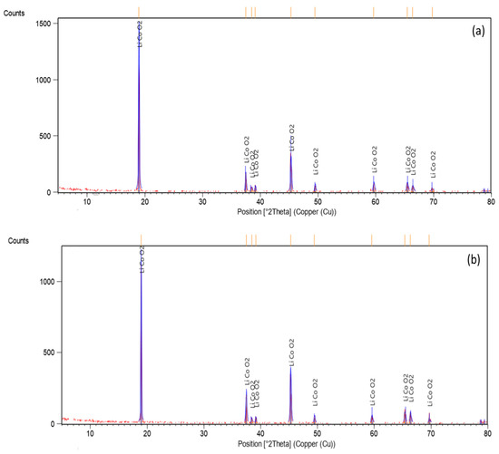 In this regard, despite the possibility that the CoCo2O4 phase is present, the diffraction peaks were indexed by the LiCoO2 phase, as the broadening of certain peaks may originate from a disorder of planes (hkl) at the crystalline structure level, among other possible reasons.
