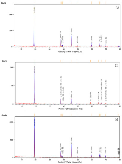 According to XRD analysis, as shown in Figure 2, all samples essentially show the peaks of the LiCoO2 phase, as indexed by the crystallographic chart 00-016-0427. However, some slightly broadened and low-intensity peaks suggest the presence of the CoCo2O4 phase.