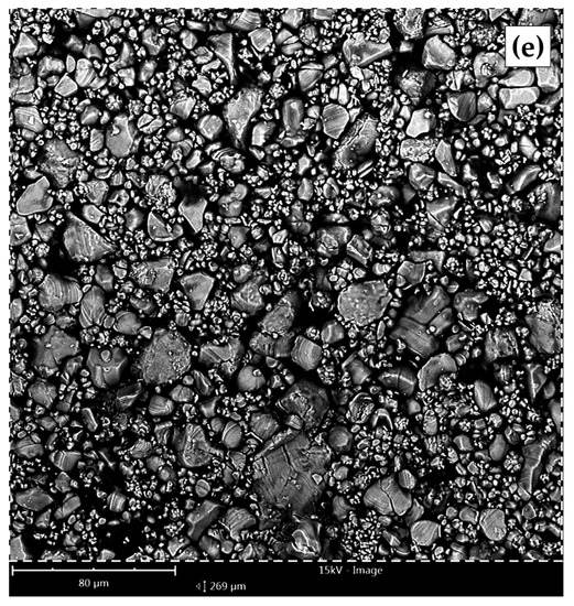Grain size detail of LIBs’ cathode powders by SEM (15 kV, scale bar = 80 µm, 1000 magnification) for Samsung (a), LG (b), Nokia (c), Motorola (d), and Apple (e).