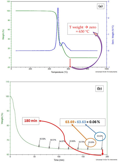 The remaining mass after 160 min of heat treatment was 63.69% of the original value, and after 180 min it was 63.63%—as shown in Figure 4b—which justifies ceasing the test, as this percentage difference (0.06%) is lower than equipment detection error limit (0.10%), corroborating the results of Natarajan et al. [30].