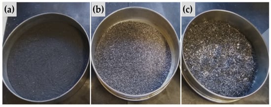 Sample fractions after the comminution process and granulometric separation. F1: under 500 µm (a); F2: 500–1000 µm (b); F3: above 1000 µm (c).