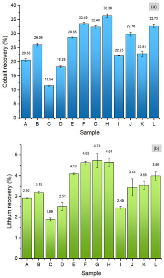 According to Figure 6a, when comparing samples B, F, and H (in the case of cobalt leached by sulfuric acid and H2O2), an increase was observed from B to F (26.08 to 33.49%, gain of 28.41%), and a smaller improvement was seen from F to H (33.49 to 36.36%, gain of 8.56%). Performing this analysis for samples D, J, and L (in the case of cobalt leached by DL-malic acid and H2O2), a great improvement was observed from D to J (18.29 to 29.78%, gain of 62.82%), and a gain of 9.90% (29.78 to 32.73%) was seen from J to L. In both situations a larger improvement occurred when switching from non-pretreatment to 1 h of pretreatment than from 1 h to 3 h of pretreatment.