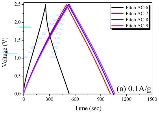 In Figure 8a, the GCD curve of Pitch AC-6 is observed to be irreversible in shape, and the charge and discharge curves are not symmetrical. The sizes of the solvated electrolyte ions in 1 M SBPBF4/PC are 1.35 to 1.40 nm [41]. As shown in Figure 6a, Pitch AC-6 has a very narrow PSD curve with a pore diameter of 1 nm. In other words, Pitch AC-6 had a smaller PSD curve than that of the solvated ions. Accordingly, Pitch AC-6 was considered to have an irreversible GCD curve due to its higher ion charge transfer resistance than the other samples.