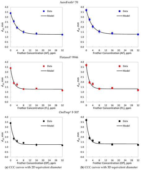 The bubble size distribution (BSD) and the respective Sauter mean diameter () were calculated for the different frother types and concentrations using both equivalent-diameter schemes. The 2D and 3D Sauter means were used to plot critical coalescence concentration (CCC) curves and calculate the [36,37] for each representation and experimental condition. The 2D and 3D bubble size estimations of Equations (1) and (4c) were studied, as they have commonly and arbitrarily been used to characterize CCC curves [29,30,31,32]. The curves were fitted using the model for as a function of frother concentration proposed by Nesset et al. [36]: