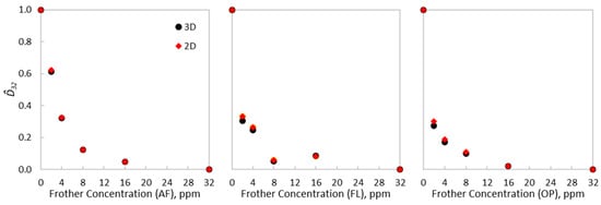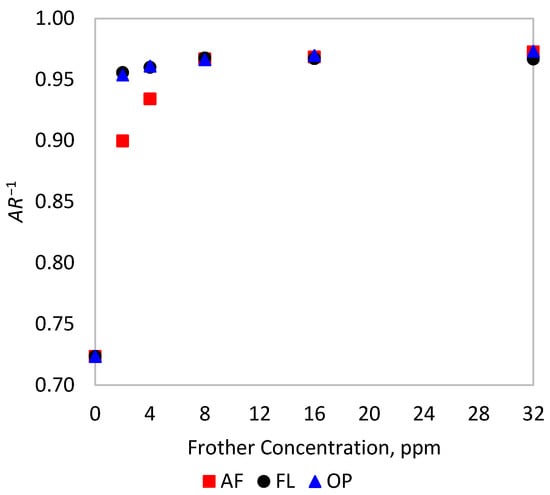 The 2D and 3D equivalent diameters can be expressed in terms of aspect ratio () by replacing in Equations (2) and (4c), respectively. The effect of frother on the aspect ratio is explored in Figure 2, showing the reciprocal of the median of AR at different frother concentrations. From this result, not all frothers affect the shape of the bubbles at the same rate. Flotanol® 9946 and OrePrep® F-507 quickly change the shape of bubbles, reaching sphere-like bubbles with at 2 ppm, while a higher AeroFroth® 70 dosage is required to make bubbles spherical, near 8 ppm.