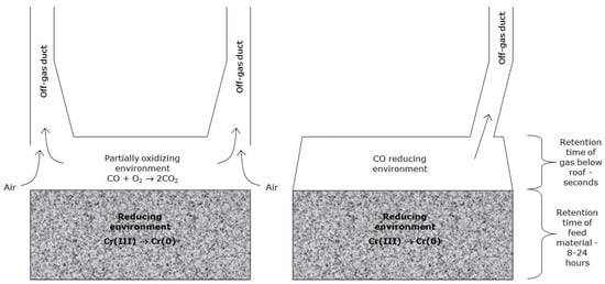 - Conventional semi-closed SAFs mainly consume coarse (also referred to as lumpy) chromite, reductants, and fluxes, coupled with bag filter off-gas treatment. This is the oldest technology applied in South Africa, but it still accounts for a substantial fraction of overall FeCr production (locally and globally) [23,49]. The Process Steps used are 6, 8–10, and 12 in Figure 3 [30,50]. In certain cases, pelletized chromite is also smelted in these furnaces, and Process Steps 1–5 may also be included [30,50]. The majority of South African semi-closed SAFs operate on an acid slag regime (BF < 1). Coarse materials are utilized as they allow process gasses to permeate through the furnace bed [42]. Fine materials (<6 mm) are avoided (or at least limited) as they may facilitate furnace bed sintering, which traps the evolving process gasses and subsequently increases the risk of furnace bed turnovers and eruptions [14,23]. It is however not impossible to smelt a relatively small amount of fines in these SAFs [23]. Operation benefits of semi-closed SAFs include simplicity of operation (i.e., the option to exclude raw material screening), easily accessible electrode equipment and furnace bed (i.e., easier maintenance compared to closed SAFs), and furnace bed visibility (i.e., visually determining process condition). Furthermore, the lack of sophisticated control systems means that less capital is required for FeCr production by semi-closed SAFs. However, these SAFs have lower metallurgical and thermal efficiencies [51].