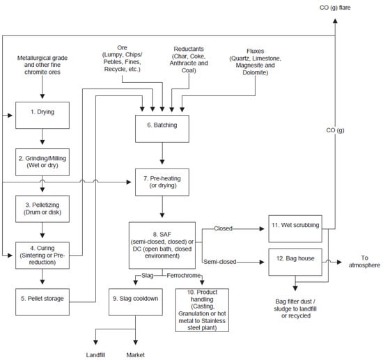 A generalized flow diagram indicating the most common process steps utilized by FeCr producers (adapted by [30] from [14,23]). Reprinted from Ref. [30] with permission from Elsevier (Amsterdam, The Netherlands).