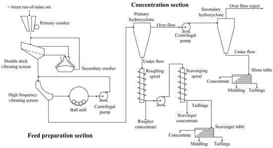Run-of-mine (ROM) chromite beneficiation process to produce typical metallurgical-grade chromite concentrate [10]. Reprinted from Reference [10] with permission from Elsevier.