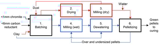 As indicated in Section 2.2, pre-reduced and oxidative sintered pellets are the two pellet types mainly produced and smelted in closed SAFs. These pellet types and their generation process steps differ from one another. Figure 5 shows a flow diagram of the green pellet generation processes for pellets intended for pre-reduction (indicated in red) or oxidative sintering (indicated in blue) curing processes. Common process steps are indicated in black.