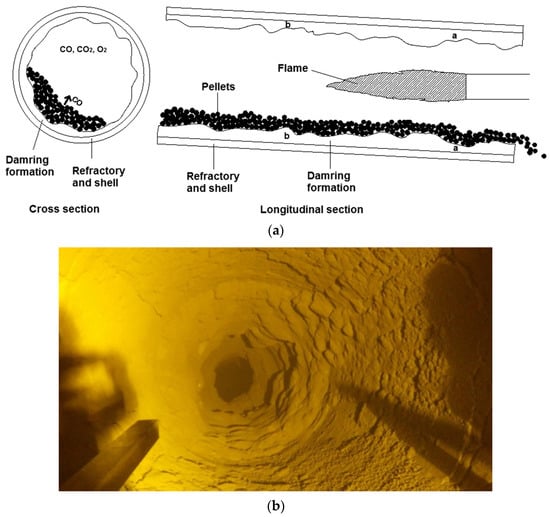 Illustration of the cross and longitudinal sections of a rotary kiln used in pelletized chromite pre-reduction (a) and an example of damring build-up inside a pelletized chromite pre-reduction kiln (b) [80]. Reproduced from Reference [80] with permission from Springer under Creative Commons Attribution 4.0 International License http://creativecommons.org/licenses/by/4.0/ (accessed on 2 May 2023).