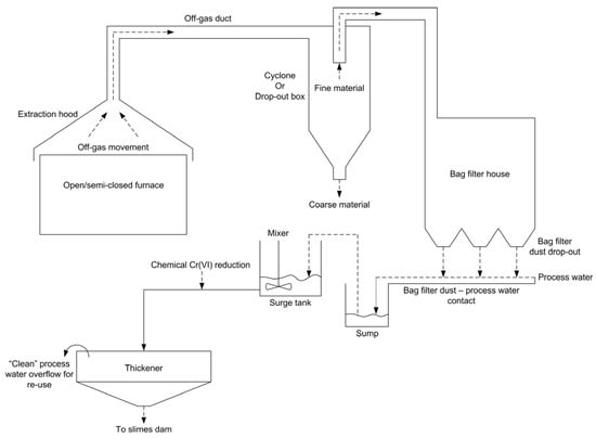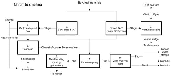 There are four relatively well-defined process combinations employed during chromite smelting [15,23,30]. A short description of each combination is presented within the context of the generalized flow diagram (Figure 3), indicating the most commonly applied process steps [14,20,23,43].