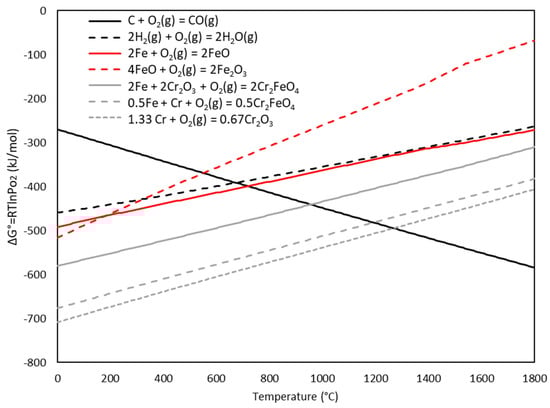 As can be seen from Reactions 6–8, the ∆H°298K values are lower than for Reactions 1–3. This suggests that the reactions between the Fe- and Cr-oxides and CO(g) will proceed at lower temperatures when compared to solid C. More so, it is known that Fe-oxides are reduced to a greater extent in the upper part of the furnace when compared to Cr-oxides via CO(g) [38,39,40], which coincides with the presented ∆H°298K values shown for Reactions 6–8.
