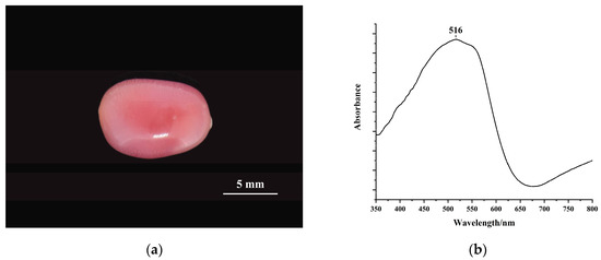 We chose two methods to characterize the color of conch pearl, namely photographing under a D65 standard light source and UV-Vis spectroscopy. The results are shown in Figure 1a,b.