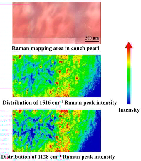 Similar to freshwater pearls, red corals, shells, and other such biominerals, there are Raman peaks of inorganic mineral (aragonite) and organic pigments (polyenes) in the Raman spectra of conch pearl. There are peaks at 1516, 1298, 1204, 1128, 1087, 1017, 707, and 704 cm−1 in the Raman spectrum of conch pearl as shown in Figure 2. Among them, the peaks at 1087, 707, and 704 cm−1 are assigned to the inorganic mineral aragonite and the positions of these peaks are very stationary for pure aragonite [7,14]. The Raman peak at 1087 cm−1 has the strongest peak intensity and stable position, thus we use this Raman peak as the base for normalization. All three Raman spectra in Figure 2 are normalized results. The peaks at 1516, 1298, 1204, 1128, and 1017 cm−1 may belong to the polyene pigment [1]. It can be found that the peaks at 1516, 1298, 1204, 1128, and 1017 cm−1 vary with the different intensities of the colors and the intensity of these peaks will be stronger at the locations where the pink color is relatively intense. Due to the very high intensity of C=C and C–C stretching vibrations (as the result of numerous conjugated double bonds), the corresponding Raman peaks at 1516 cm−1 and 1128 cm−1 are clearly visible [26,27]. Especially, there is a relatively direct relationship between the Raman shifts of the two peaks and the chain length of polyene [26]. At the same time, the areas on the conch pearl with color variations were selected for Raman mapping to obtain the distribution characteristics of Raman spectral peak intensities. The intensity distributions of peaks at 1516 cm−1 and 1128 cm−1 on the surface of the conch pearl are shown in Figure 3.