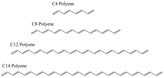 Schematic presentation of linear polyene chains with different C=C double bonds.