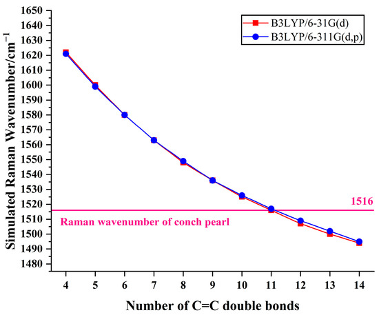 Through the experimental Raman spectrum of conch pearl, we discovered that the position of the C=C double bond stretching vibration of the polyene pigment is at 1516 cm−1. The polyene pigment, which directly determines the color of conch pearl, may be pink. Therefore, we mark a pink line horizontally at 1516 cm−1 of the ordinate in Figure 5. The position of the intersection of the pink line and the blue dotted line curve and the red dotted line curve in Figure 5 is very accurate. It is not between the points in the point-line curve, but directly intersects with the points in the point–line curve. The number of C=C double bonds corresponding to the abscissa of the intersection point is 11, which indicates that the pigment structure contained in conch pearl may contain 11 C=C double bonds. Therefore, we preliminarily judge that the pink color may be caused by polyene containing 11 C=C double bonds.