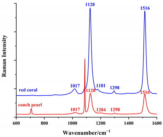 It can be seen from Figure 6 that the features in the Raman spectrum of red coral is highly similar to conch pearl. The inorganic minerals in red coral and conch pearl are mainly calcite and aragonite, respectively. The intensities of the Raman peaks of the two inorganic minerals are different. We mainly focus on the Raman peaks of polyene when discussing the pigment of conch pearl. The Raman peaks of pigment in red coral are mainly located at 1516, 1298, 1181, 1128, and 1017 cm−1 and the Raman peaks of pigment in conch pearl are mainly located at 1516, 1298, 1204, 1128, and 1017 cm−1. Except for the peak at 1181 cm−1 of red coral and peak at 1204 cm−1 of conch pearl, the other peaks are completely consistent. According to their Raman spectra, we believe that the pink pigment of conch pearl is very similar to the red pigment of red coral and may even be the same pigment. The slight difference in peaks may be caused by the different environment of pigments in different biominerals. The Raman peaks of pigments in conch pearl and red coral and the assignments of these peaks are shown in Table 1.