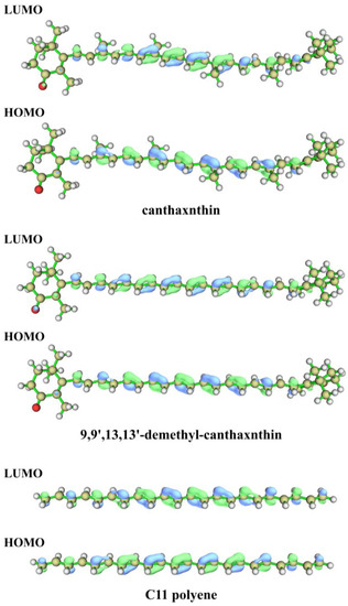Highest Occupied Molecular Orbital (HOMO) and Lowest Unoccupied Molecular Orbital (LUMO) of canthaxanthin, 9,9′,13,13′-demethyl-canthaxnthin, and C11 polyene.