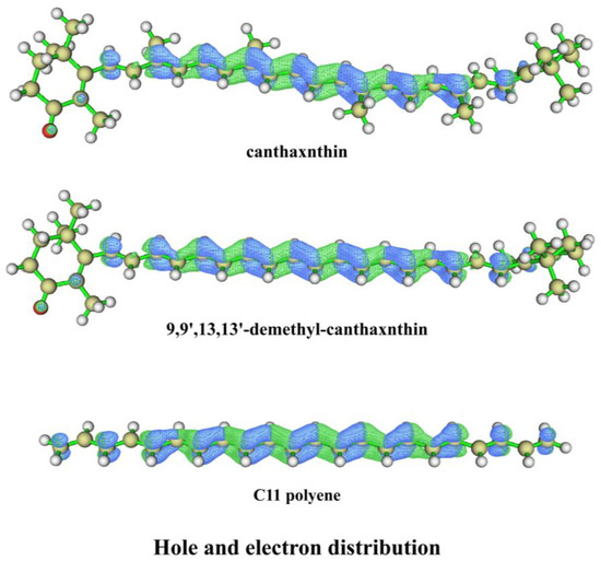 Hole and electron distribution and charge density difference of canthaxanthin, 9,9′,13,13′-demethyl-canthaxnthin, and C11 polyene. The blue isosurface represents a hole and the green isosurface represents an electron.