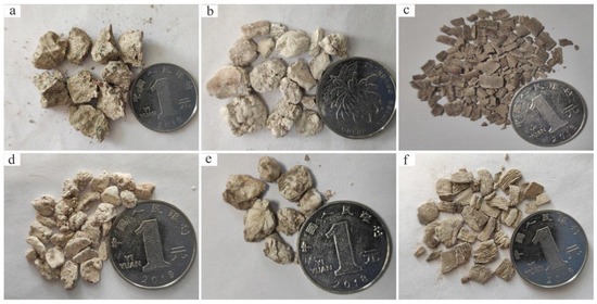 Pictures of partial gypsum samples: (a) gypsum of Ak2-1 at the 3902 m; (b) gypsum of Kd101-5 at the 2775 m; (c) gypsum of Qun6-5 at the 4594 m; (d) gypsum of S1-1 at the 664 m; (e) gypsum of Tc2-3 at the 4399 m; (f) gypsum of Wx1-21 at the 3630 m.