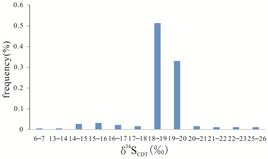 The test results show that the distribution range of gypsum δ34S values in different depth segments is large, with a range of 6.69‰–25.92‰, and an average of 18.64‰. The sample with a maximum of 25.92% was found at a depth of 2775 m (Figure 2b), and the sample with a minimum of 6.69% was found at a depth of 664 m (Figure 2d). The difference value between the maximum and minimum is 19.23%. However, the distribution range is relatively concentrated, with 84.49% of them in the range of 18‰~20‰. All data are shown in Table 1, and distribution characteristics are shown in Figure 3.