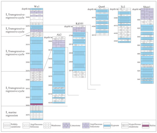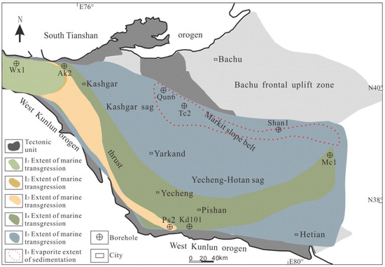 However, the strata where the boreholes are located may have undergone superimposed thickening or tip extinction due to the influence of multiple periods of transgressive–regressive events and later tectonic evolution in the Yarkand Basin during the Paleocene, which may destroy the complete sedimentary sequence of evaporite. It is impossible to reconstruct the Paleocene sulfur isotopic curve simply according to the depth of borehole samples. Therefore, it is necessary to reorder these boreholes according to the sequence of rocks formed by transgression and regression. For evaporite basins affected by the ocean, Cao (2022) identified five stages of transgressive–regression events through the evaporite–limestone sedimentary cycles in different areas of the basin and reconstructed the stages of marine transgressive–regression and the scope of each stage of the Yarkand Basin [19]. The stages and scopes of them are shown in Figure 4.