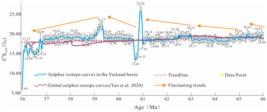 Paleocene sulfur isotope curves in the Yarkand Basin and the global Paleocene sulfur isotope curves. The purple LOWESS curve is constructed by utilizing the latest sulfur isotope data from 56 Ma to 66 Ma [15]. The blue curve is from the data of WX1, AK2, Kd101, Qun6, Tc2, and Shan1 boreholes of the Yarkand Basin during the Paleocene.
