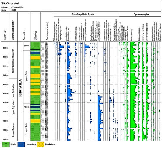 The marker dinoflagellate cyst Gonyaulacysta adecta was elevated from Gonyaulacysta jurassica subsp. adecta to the current species level [44]. The common occurrence of G. adecta was reported during the Callovian (Figure 5), while rare to low occurrences occurred during the Bathonian and early Oxfordian. It is used as a Middle Jurassic index species with geographically extensive records in Western Gondwana and Laurasia, reinforcing an age no younger than Callovian [44]. In the THAX-1 well, low to common occurrences of G. adecta are reported within the upper part of the Khatatba Formation, reinforcing the proposed Middle Jurassic (Bathonian–Callovian).