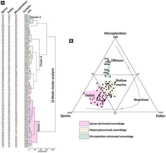 (A) Cluster analysis of spores, pollen grains, and microplankton groups recovered from the Khatatba Formation from the THAX-1 well using the Ward method [30]. (B) Spores-Pollen-Microplankton ternary diagram illustrating the plot of the Middle Jurassic Khatatba Formation samples from the THAX-1 well, Dahab-Mireir Basin [32].