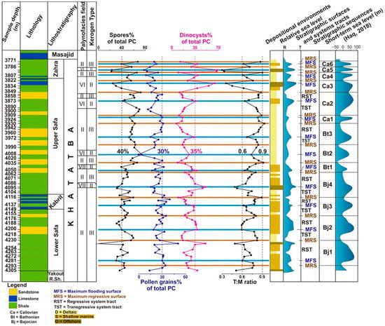 During the Middle Jurassic, consequent short-term fluctuations in relative sea level took place, which can be inferred in terms of stratigraphic variations in palynomorph composition (Figure 9). The Khatatba Formation lithology shows cyclic alternations between shales and fine- to coarse-grained sandstones with minor limestone interbeds. This sedimentary record represents a chance to apply the transgressive-regressive (T-R) sequence stratigraphy model following third-order depositional cycles to subdivide the Khatatba Formation into stratigraphic sequences, systems tracts, and their related bounding surfaces [8,59]. This provides a better understanding of the Khatatba Formation’s main source rock and possible reservoir intervals. Generally, the transgressive-regressive sequence model is comprised of the transgressive systems tract (TST) that represents offshore marine sediments, followed by the regressive systems tract (RST) that occupies shallower facies. These two systems tracts are separated by two stratigraphic surfaces, which are the maximum flooding surface (MFS) and maximum regressive surface (MRS) [60]. The RST sediments are bounded in the upper part by a MRS and/or a correlative subaerial unconformity surface, which takes place during a full cycle of sea level change triggered by local to regional tectonism and/or eustacy [9,10,59].