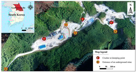 Seongshin Minefield Co. (37°1712″ N, 128°4353″ E) in South Korea was selected as the research area, and an ML–DES hybrid model was developed to predict the truck cycle time and ore production of a mine haulage system using truck operation time data collected in the research area (Figure 1). The mine produces approximately 4500 metric tons of limestone per day by applying the room and pillar method. Ore production takes place 8 h a day, excluding lunch breaks (1 h). The mined limestone is loaded into a truck by a loader and transported to the processing plant after being classified by grade. Table 1 shows the types and number of equipment units used to load and transport ore or waste in the study area. In the study area, 3 loaders (with bucket sizes of 4.76 to 5.70) and 10 trucks (with loading capacities of 23 and 37 metric tons) are used to produce the limestone ore. In addition, the mine operates 8 loading points with different ore grades and 3 dumping points (crushers). The production manager establishes a daily production plan considering the daily target of ore production and grade. After establishing the daily production plan, the manager dispatches loaders and trucks to three loading points. The trucks move to the loading point, load the ore, and haul it to the processing plant. The trucks that have dumped the ore move back to the loading point and repeat the ore hauling operation.