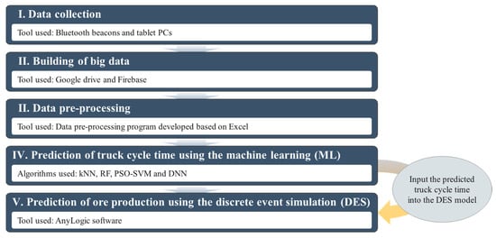 In this study, we developed an ML–DES hybrid model that can predict the ore production of a mine haulage system by combining two techniques, machine learning and discrete event simulation. Figure 3 shows the operating principle for the ML–DES hybrid model. First, log data for the mine haulage system were collected using Bluetooth beacons and tablet PCs. The collected log data were uploaded to a cloud server and stored over a long period of time. The collected log data were pre-processed so that they could be used as input data for the ML model to predict the truck cycle time. Next, an ML model for predicting the truck cycle time was developed, and the truck cycle time was predicted for each truck and section using the pre-processed data and the data affecting the truck cycle time. Finally, the predicted truck cycle time was used as the input data for the DES model to predict ore production, and ore production by truck and loading point was predicted.