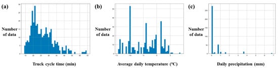 Characteristics of datasets to train the machine learning models: (a) truck cycle time, (b) daily mean temperature, and (c) precipitation.