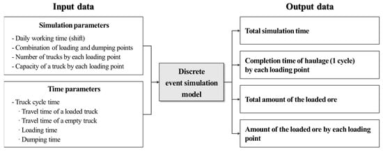 A DES model was designed to predict ore production in the study area by using the truck cycle time predicted by the ML model as input data. Figure 5 shows a schematic diagram of the input data used to predict the ore production and output data after simulation using the DES model to simulate the mine haulage system. The input data of the simulation model were divided into simulation factors related to the operating conditions and time factors related to the time required for the unit tasks. The simulation parameters related to the operating conditions included the operating time (simulation time), truck ID, truck capacity, and loading point, and the time parameters included the travel time, loading time, and dumping time. The output data of the simulation model included the total operating time, number of loading and haulage, amount of loaded ore, and time of haulage for one cycle.