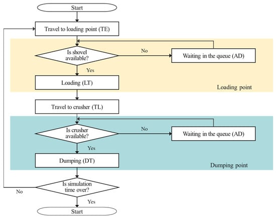 Figure 6 shows the simulation algorithm for the mine haulage system designed according to the research area and truck cycle time (TCT) theory. The TCT theory was proposed by Suboleski [48], and it can be explained using the following equation: