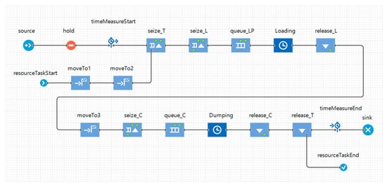 where TCT means truck cycle time, STL is the spotting time in the loader, LT is the loading time, TL is the travel time of the loaded truck, STD is the spotting time in the dumping point, DT is the dumping time, TE is the travel time of the empty truck, and AD denotes the average delay time. This is the delay time that can be caused by the truck waiting for work at the loading or dumping point. The truck dispatched into the system was designed to move to a designated loading point, transport the ores to the crusher, and continue to perform the operation for a simulation time set in advance by the user. In this study, a simulation model reflecting the designed simulation algorithm was developed and implemented using the AnyLogic software, as shown in Figure 7. In addition, the layout of the simulation model was designed considering loading and dumping points and haulage routes, as shown in Figure 2. The simulation model in Figure 7 shows the model for one truck allocated to one specific loading point and can be expanded by considering the types and numbers of trucks and the number of loading points. Table 5 presents the functions of each block in the simulation model.