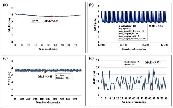 Four ML models (kNN, RF, PSO–SVM, and DNN) were used to predict the TCT. For each model, the parameters related to the learning accuracy listed in Table 4 were optimized, and a predictive model with the best performance was designed. The prediction accuracy of the kNN model depends on parameter k. Figure 8a shows the accuracy of the model by increasing k by 1 from 1 to 100. The prediction accuracy of the kNN model was highest when k = 53. Based on the training dataset, the MAE shows the lowest error of 3.74 min. The accuracy of the RF model is related to six hyperparameters. Figure 8b illustrates the learning accuracy of the RF model, which varies owing to changes in the parameter values. The RF has the lowest error of 3.83 (min) when n_estimators is 100, ccp_alpha is 2, min_impurity_decrease is 2, min_samples_leaf is 6, min_samples_split is 5, and min_weight_fraction_leaf is 0. The learning accuracy of the PSO–SVM model is determined by the parameters C and , and Figure 8c shows the learning accuracy of the model according to changes in the parameters C and . The PSO–SVM model showed the best performance with an MAE of 3.45 (min) when C was set to approximately 30.21 and to approximately 0.61. The learning accuracy of the DNN model varied according to the number of hidden layers and nodes. Figure 8d shows the learning accuracy of the model according to changes in the parameters. The DNN model showed the smallest error (MAE = 3.97 (min)) when the number of hidden layers was 9 and the number of nodes was 20.