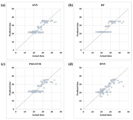 The performance of the ML model was evaluated using MAE, MSE, RMSE, and R2, which are performance indicators mainly used in regression models. Table 6 shows the performance index of each model. The performance indicators for the kNN model are as follows: MAE of 2.89 (min), MSE of 13.65 (min2), RMSE of 3.69 (min), and R2 of 0.69 (Figure 9a). The RF model was confirmed to be biased towards the maximum and minimum values of the cycle time prediction (Figure 9b). In addition, the values of the performance indicators were as follows: MAE, 2.88 (min); MSE, 15.40 (min2); RMSE, 3.92 (min); and R2, 0.65. The results from the PSO–SVR model are shown in Figure 9c. Owing to the difference between the predicted values and the actual data, the MAE is 2.79 (min), MSE is 14.29 (min2), RMSE is 3.78 (min), and R2 is 0.68. The verification results of the DNN model are presented in Figure 9d. The MAE is 2.95 (min), MSE is 16.14 (min2), RMSE is 4.02 (min), and R2 is 0.64.