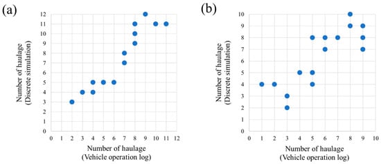 Comparison of production between vehicle operation log and discrete event simulation model: (a) morning operation; (b) afternoon operation.