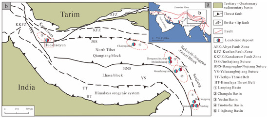 Distribution map of zinc–lead deposits in the Tethyan metallogenic belt [8]. (a). Simplified Diagram of the Tectonic Structure in the Western Tibetan Plateau. (b). Location of the Huoshaoyun deposit and the lead-zinc metallogenic basins within the Tibetan plateau. (b) is a detailed view of rectangle b in (a).