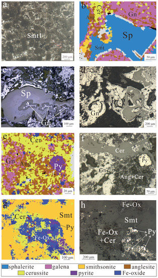The mixed ore is predominantly composed of non-sulfide minerals, including smithsonite, cerussite, and Fe-oxide, with a minor amount of primary sulfides. The majority of these non-sulfide minerals are produced through direct replacement of sulfides or the host limestone (Figure 7a). Smithsonite, which exhibits gray oolitic textures under the microscope, is the most abundant non-sulfide mineral (Figure 7a). A small amount of extremely fine-grained smithsonite directly replaces sphalerite (Figure 7b). Galena and sphalerite occur together, with early-stage galena taking the form of dendritic–skeletal (Figure 7c) or massive blocks (Figure 6d and Figure 7d) and being enveloped by colloform sphalerite (Figure 7d). A later shell of galena often forms in the outer part of the colloform sphalerite (Figure 6d,e and Figure 7c,d). Anglesite appears relatively dull under the microscope and is usually distributed inside or on the edge of galena (Figure 7e,f). Cerussite is brighter and appears pale gray under the microscope, with a relatively complete crystal structure (Figure 7e,f). The replacement of galena by anglesite and cerussite is also observed (Figure 7e,f). Pyrite displays a euhedral–subhedral structure (Figure 7g,h) and is usually oxidized to form Fe-oxide, which is surrounded by cerussite (Figure 7e).