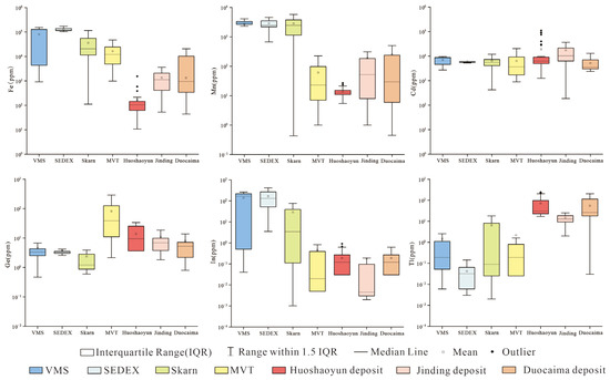 Box–whisker plots of the trace element compositions of sphalerite from Huoshaoyun, Jinding, Duocaima, MVT, VMS, Skarn, and SEDEX deposits. Note: the plots are based on data from this study, Yuan et al. [14], Ye et al. [15], Cook et al. [16], and Zhang [42].