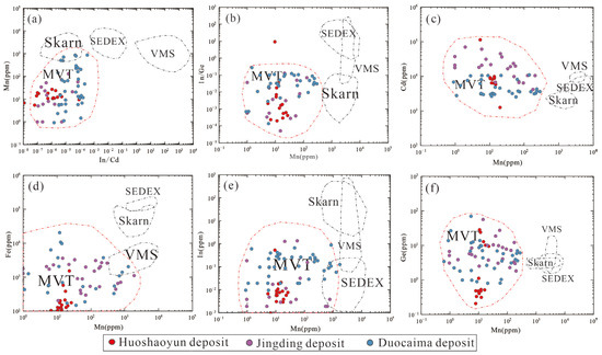 (a–f) Binary plots In/Cd vs. Mn, Mn vs. In/Ge, Mn vs. Cd, Mn vs. Fe, Mn vs. In, Mn vs. Ge in sphalerite from the Huoshaoyun deposit. Note: plotting fields were obtained from this study, Yuan et al. [14], Ye et al. [15], Cook et al. [16], and Zhang [42].