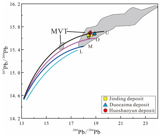 Correlative diagrams of 206Pb/204Pb vs. 207Pb/204Pb (modified from Xiong et al. [60]) for the Huoshaoyun, Jinding, and Duocaima deposits. Note: the plots are based on data from Gao et al. [7], Wu. [58], Zhang [59], Zhang [42]. U—upper crust; O—orogene; M—mantle; L—lower crust. The region shaded grey represents the extent of MVT deposits.