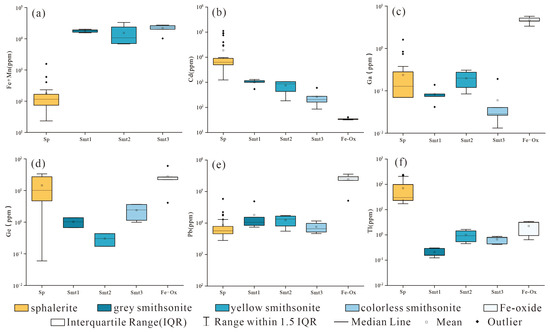 Trace element comparison of sphalerite, different stages of smithsonite, and Fe-oxide in the Huoshaoyun Zn-Pb deposit. (a)–(f) represent the comparison of Fe+Mn, Cd, Ga, Ge, Pb, and Tl elements in different minerals.