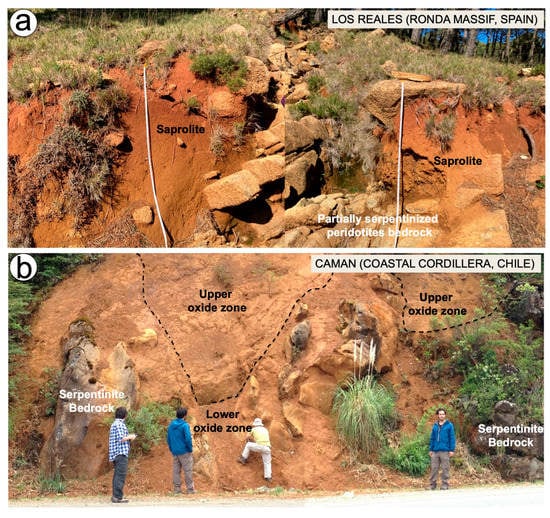 - Zamarsky, V.V.; Salmon, H.O.; Tabok, M. Estudio geoquímico de los productos de intemperismo de las rocas ultrabásicas (serpentinitas) en la provincia de Valdivia, Chile. Rev. Geológica De Chile: Int. J. Andean Geol. 1974, 1, 81–102. [Google Scholar]