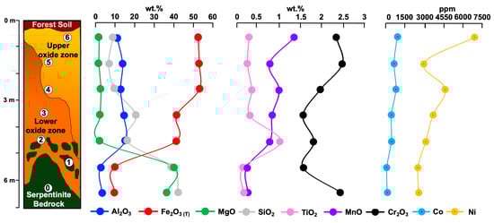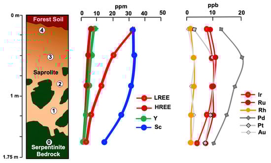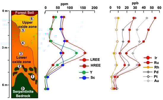 - Ulrich, M.; Cathelineau, M.; Muñoz, M.; Boiron, M.C.; Teitler, Y.; Karpoff, A.M. The relative distribution of critical (Sc, REE) and transition metals (Ni, Co, Cr, Mn, V) in some Ni-laterite deposits of New Caledonia. J. Geochem. Explor. 2019, 197, 93–113. [Google Scholar] [CrossRef]