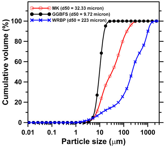 Particle Size Distribution (PSD) of MK, GGBFS, and WRBP.