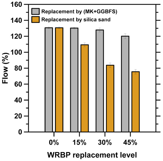 Figure 3 illustrates the effect of different WRBP contents (15, 30, and 45%) as MK and GGBFS replacement on the workability of the designed AAMs. The workability performance of the AAMs was negatively affected by the variation of WRBP contents. The mixture containing 45% of WRBP displayed the lower flow (120%) compared to the control sample (130%). The reduction in flowability of the high amount of replacement was attributed to the high porosity of WRBP, which resulted in an increment on water demand. It is well known that the high demand of water in the mixture negatively affects its workability performance. WRBP has a relatively higher inter-particle friction and, as a result, a reduction in flow is expected [38].